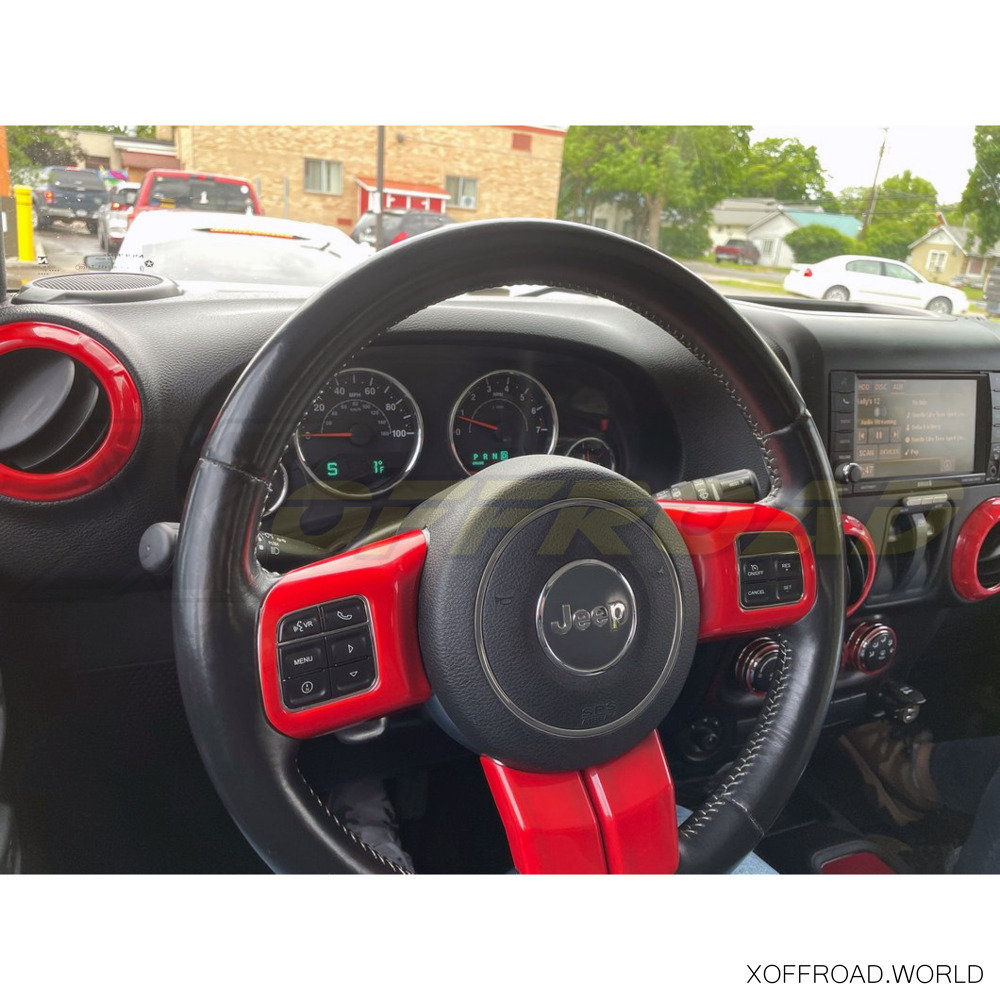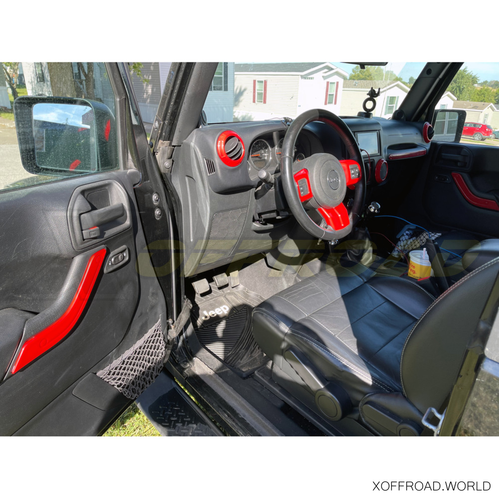 Add style and flair to the interior of your Jeep with new X-Offroad door and dashboard trim kit. Kit includes door handle inserts for interior, steering wheel cover and four air vent covers. These injection-molded plastic accents are molded directly from the factory interior pieces for an exact fit. Easy installation thanks to the pre-installed high-strength 3M tape. No drilling or cutting required. Offered in various colors always with glosy surface.