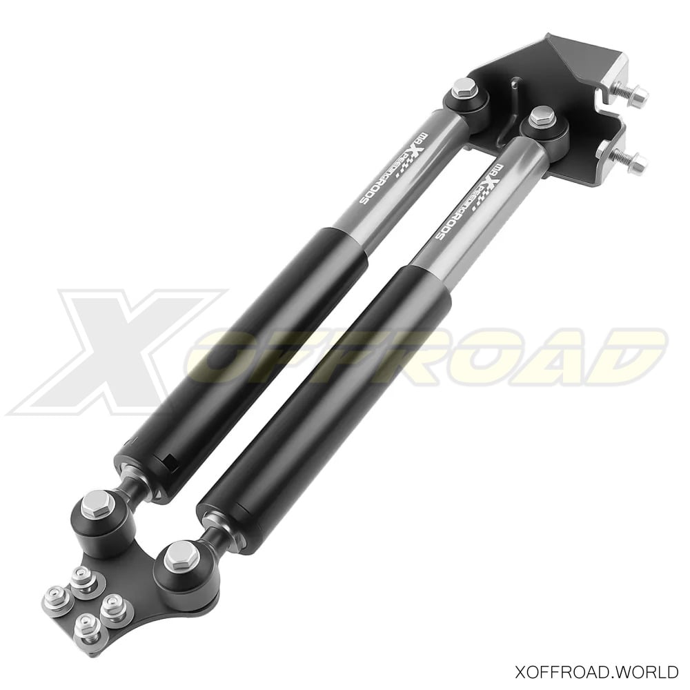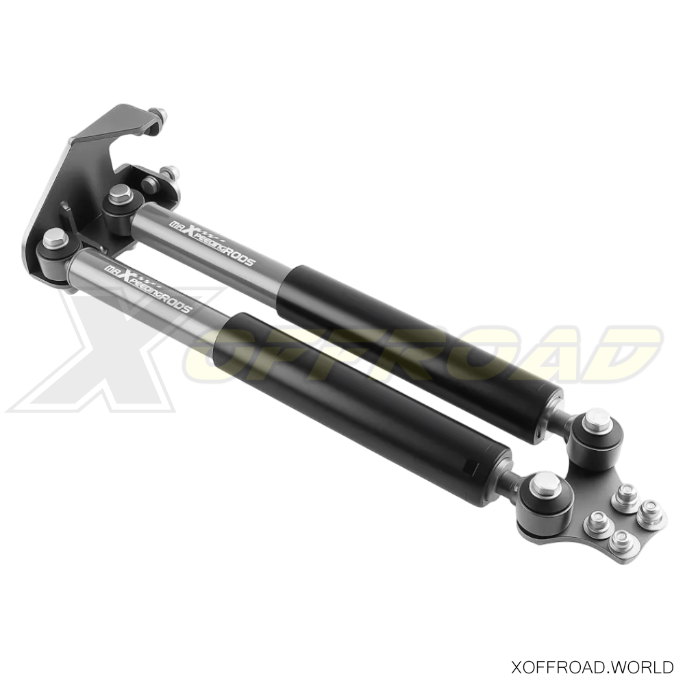 Reduce bumps and improve control and handling with of your Jeep Wrangler YJ's Dual Steering Stabilizer. This easy-to-install upgrade helps to tame your large aftermarket tires for a more enjoyable driving experience on and off-road. Designed to dampen "bump steer" and front-end vibration and increase the life of tires, ball joints and other steering components, the Steering Stabilizer is highly recommended for vehicles with aftermarket oversize tires. X-Offroad dual steering stabilizer kit is easy to install with a 100% bolt-on process. Fits to vehicles with 4" and more lift. Helps to better stabilize tires 33" and up. Does NOT fit a stock height vehicle.
